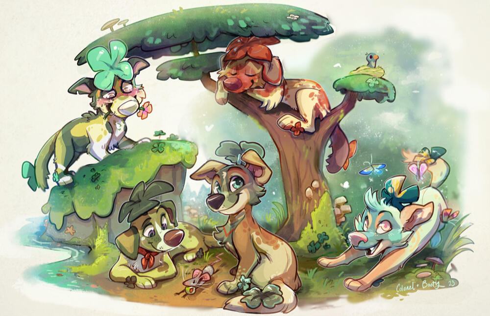 Cloverpups are puppy-ish creatures with 6 clovers that grow on their bodies; on their head, tail, and feet. They are the semi-domesticated version of Cloverdiles and are my oldest species that I am actively still creating. I am the sole creator for Cloverpups and do not offer MYO slots.My custom Cloverpup waiting list is so long that it is only for Patrons right now.You do not need to be a Patron to adopt a Cloverpup or get on my custom list. Reach out and we'll chat!
